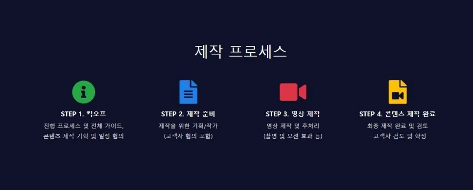 제작 프로세스는 ‘킥오프, 제작준비, 영상제작, 콘텐츠 제작 완료’ 이렇게 네 단계로 나눌 수 있답니다.