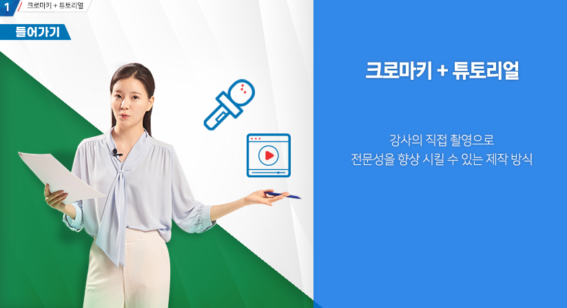 1인 강의 크로마키의 경우 강사 한분이 등장을 하여 처음부터 끝까지 강의를 이끌어 나가는 진행 유형을 말합니다.