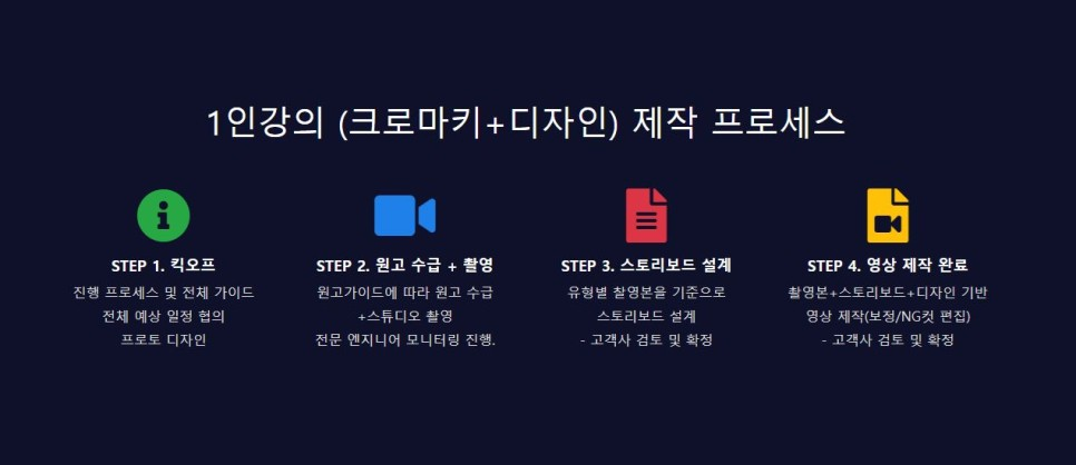 1> 킥오프 2> 원고 수급 3> 스토리보드 설계 및 구상 4> 영상 제작 완료